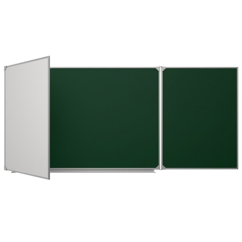 Доска школьная настенная 3-хэлементная для письма мелом и маркером, 5 рабочих поверхностей. В качестве рабочих полотен используются только высокопрочные материалы, специально предназначенные для школьных досок.