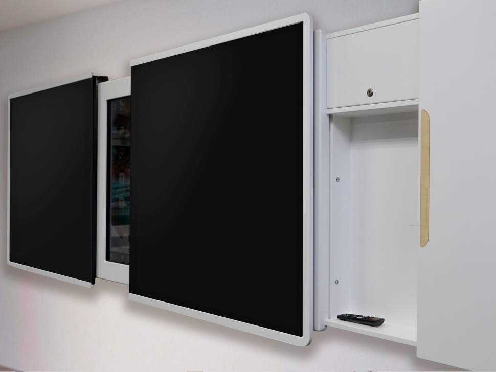 6. Удобство и эргономичность конструкции. Раздвижная система створок имеет прочную конструкцию и плавный ход благодаря доводчикам. По бокам интерактивной раздвижной доски находятся закрытые секции с полочками, где удобно хранить обучающий материал, маркеры, губки, пульты управления и прочий инвентарь, нужный для преподавательской работы. Запирающаяся на ключ секция, куда можно убрать ноутбук преподавателя, становится доступна при максимальном сдвигании двух досок в противоположную от секции сторону.