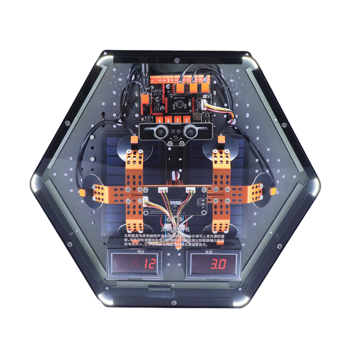 Интерактивный модуль для оформления зон рекреации, кабинетов, IT-полигона, библиотеки, медиа зоны. Модуль демонстрирует процесс использования энергии солнца для преобразования световой энергии в электрическую. Его принципы и технологии включают фотоэлектрические эффекты, фотоэлектрические элементы, инверторы и сетевые соединения. Модуль выполнен в форме шестиугольной призмы с интерактивным наполнением.