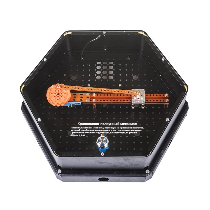 Интерактивный модуль для оформления зон рекреации, кабинетов, IT-полигона, библиотеки, медиа зоны. Модуль демонстрирует работу кривошипно-ползунного механизма и преобразование вращательного и поступательного движения. Выполнен в форме шестиугольной призмы с интерактивным наполнением.