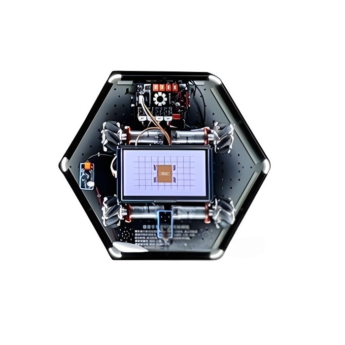 Интерактивный модуль для оформления зон рекреации, кабинетов, IT-полигона, библиотеки, медиа зоны. Модуль использует технологию голосового управления и жестов для управления движением робота с omni-колесами. Модуль выполнен в форме шестиугольной призмы с интерактивным наполнением.