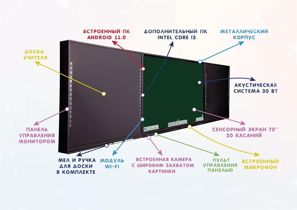 Умная классная доска, идеальное сочетание традиционной классной доски и мультимедийного учебного оборудования. Интерактивная система с поверхностью для письма беспылевым мелом или сухостираемыми маркерами. При включении устройства, средняя часть может быть использована как отдельное устройство или устройство для вывода изображения с встроенного OPS.