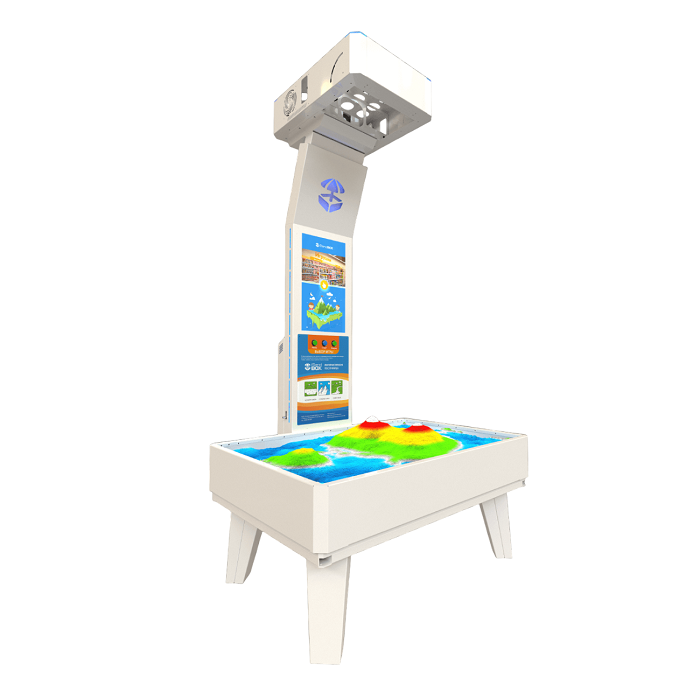 Сенсор для определения глубины, подключенный к компьютеру, замеряет расстояние до песка, программное обеспечение обрабатывает полученные от сенсора данные и подает проектору команды, каким цветом подсвечивать конкретный участок песочницы. На песок проецируются настоящие текстуры водных объектов, гор, вулканов и многих других поверхностей. В итоге, наша песочница дает Вам возможность своими руками создать собственный мир, который можно изменить одним движением руки.