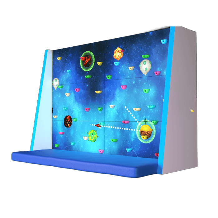 Интерактивный скалодром – пока дети занимаются скалолазанием, решаются педагогические задачи. За крепления удобно цепляться, и ничто не может остановить маленького исследователя на пути к цели. Дети ловко взбираются по вертикальной поверхности и решают логические задачки, учатся различать цвета и формы, считают, анализируют и выбирают верные ответы быстро и в постоянном движении. Дети могут работать как индивидуально, так и в команде. Оказываясь в пространстве скалодрома, ребёнок словно попадает в другой мир: благодаря невероятной графике он отправляется в межгалактическое путешествие. Мгновение, и вот уже он собирает урожай у бабушки в деревне.