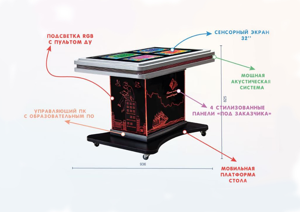 Антивандальная поверхность сенсорного 32 дюймового экрана привлекает качественным и четким изображением, высокопроизводительный ПК быстро воспроизведет весь загруженный контент и программы, увеличенная мощность динамиков позволит услышать звуковую информацию даже из дальних углов образовательной аудитории, а регулируемая подсветка RGB акцентирует внимание на стилизованных фасадах стола, изображения на которых наносятся по согласованию (это могут быть гербы страны, региона, города или учреждения или любые другие изображения).