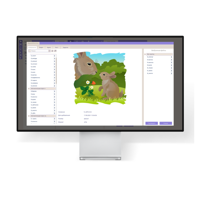 • Специалист может пополнять библиотеку программы, загружая свои изображения/видео/аудио/тексты.