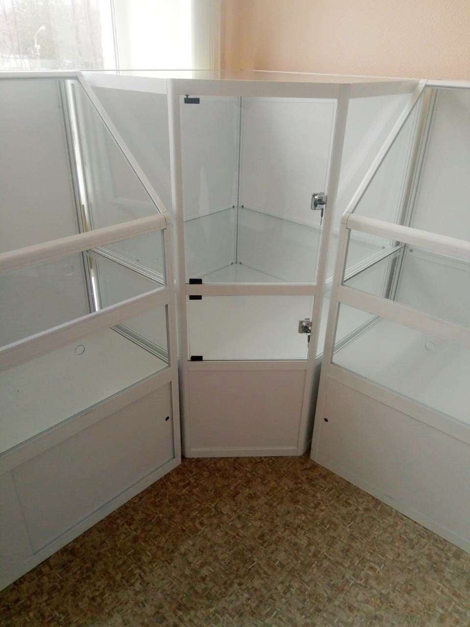 Стенд-витрина выполнен из алюминиевого профиля, полки из минерального стекла -5 мм, дверцы и боковые стенки из минерального стекла -4 мм.
