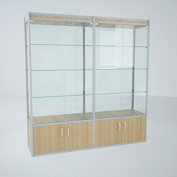 В комплект витрины входит три стеклянные полки (в каждой секции), задняя стенка стекло, замки на дверках. Возможно, заменить заднюю стенку на двп или зеркало. В верхней части подсветка (два точечных светильника).