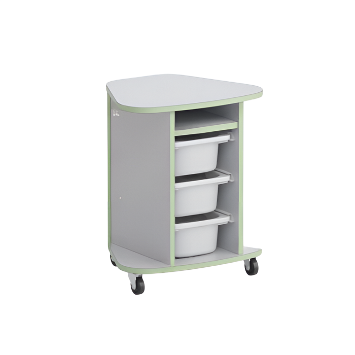Тумба Робик выполнена из ламинированной ДСП 16 мм, края обрамлены кромкой ПВХ 2 мм и установлена на 4 колеса (два колеса с тормозом). Крышка тумбы имеет форму сектора в 45 градусов от кольца. Углы крышки закруглены радиусом. В тумбе на направляющих установлены три пластиковых лотка высотой 100 мм (длина лотка – 210 мм, ширина – 300 мм). Над лотками имеется полочка.
