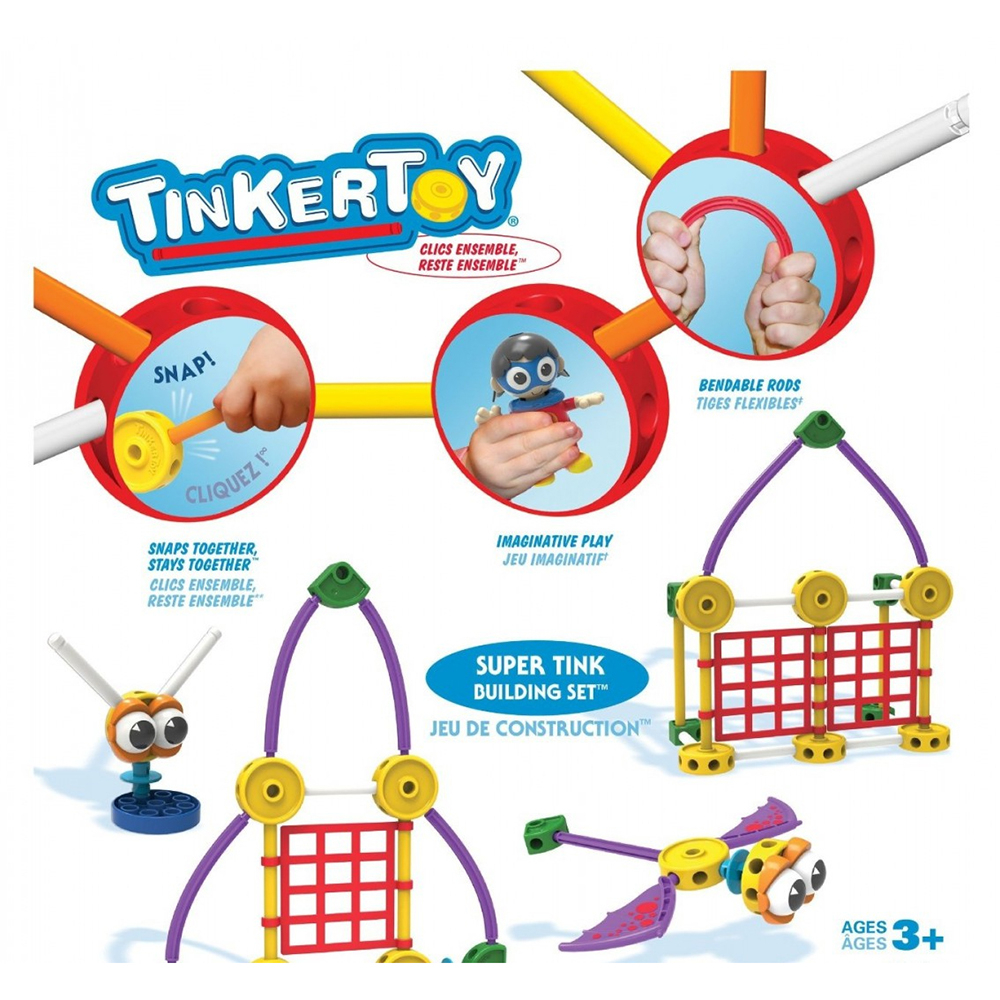 Красочный конструктор состоит из ярких пластиковых деталей, которые соединяются посредством уникальной технологии крепления. Конструктор K'NEX ТИНКЕРТОЙ "Строительный набор СУПЕР" имеет  крупные, разноцветные детали. Их удобно захватывать и соединять, что позволяет сохранять игровую деятельность и интерес к постройкам.  С этим конструктором ребенок учится читать рисунок-схему, запоминает названия новых для себя деталей.