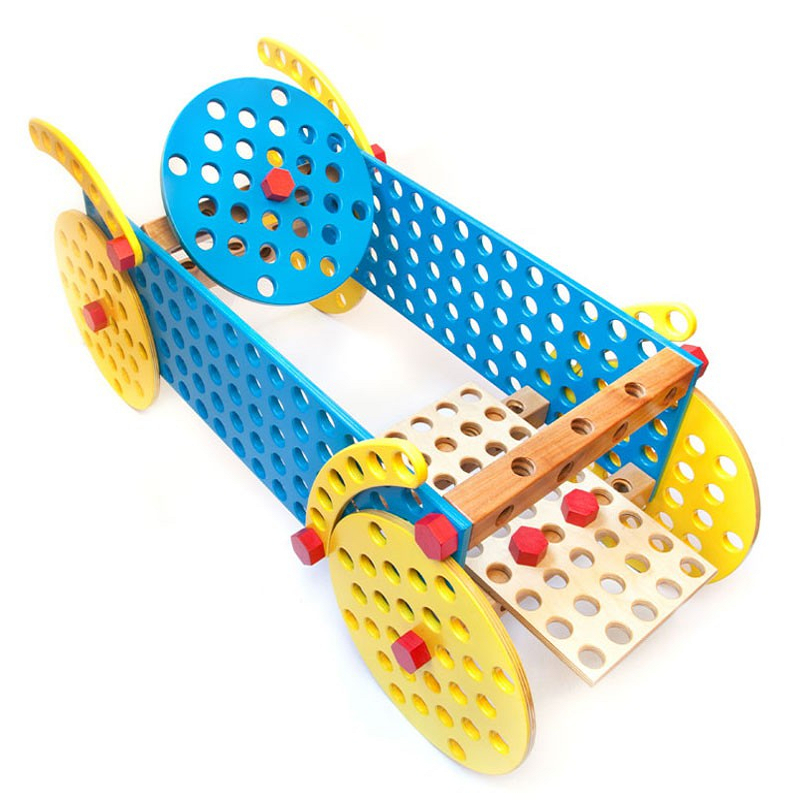 В комплекте деревянные винты и болты. Данная комплектация дает возможность собрать две модели наземного транспорта - мотоцикл и машину.