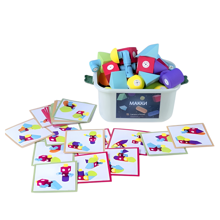 Конструктор «МАККИ 60» — набор цветных магнитных деталей, крупных геометрических фигур с магнитными креплениями. Детали конструктора окрашены в приятные однотонные цвета, со звуковым эффектом погремушки.