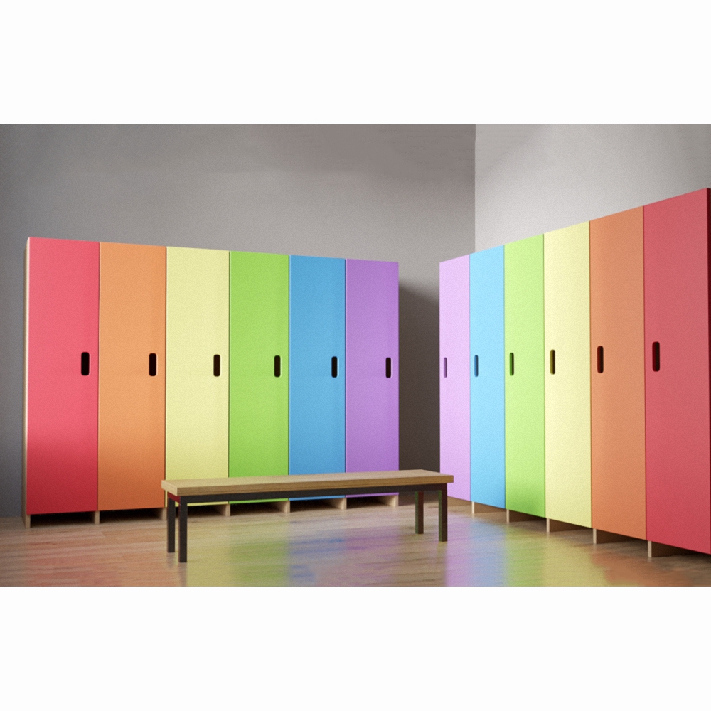 Детский гардероб «Радуга» — яркие стеллажи для детей разных возрастов, которые оснащены элементами в виде крючков и полок для складывания одежды и обуви. Дети могут самостоятельно, без помощи взрослых, складывать свои вещи в шкафчик, развивая самостоятельность. Данный гардероб «Радуга» выступает как специализированная мебель для детей, может стать прекрасным дополнением к полноценному гардеробу в интерьере детского центра, детского сада, а также подойдет для специальных школ и интернатов.