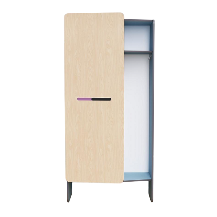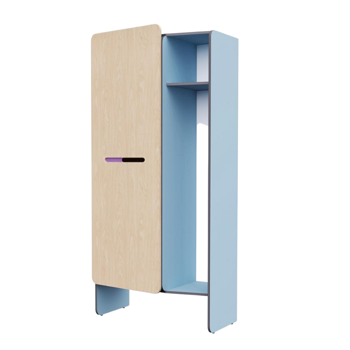 Дизайн шкафа позволяет выбирать сторону открывания дверей, а сохранность личных вещей обеспечивает наличие замка с ключами. Шкаф снабжен надёжными крючками и полками для одежды.