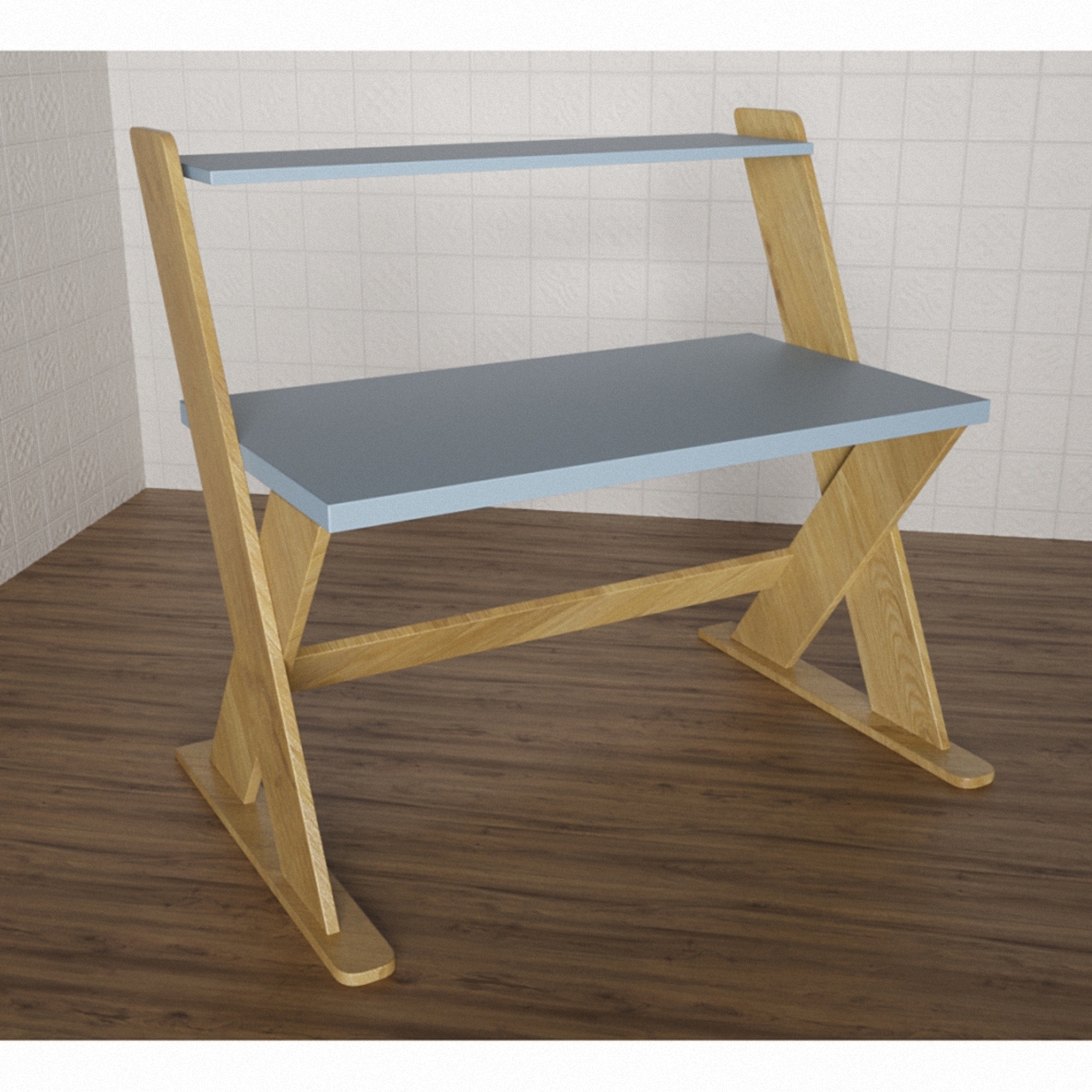 Стол “Малыши-карандаши” имеет очень простую, но оригинальную конструкцию - состоит из 4-х находящихся под оптимальным углом наклона ножек, расположенных крест-накрест, и столешницы формы прямоугольника. Сверху имеется небольшая полочка для хранения письменных принадлежностей. За ним можно разместить 1-2 ребёнка. Нужен для групп в ДОУ, подойдет также для занятий в начальных классах, коррекционных и развивающих центрах. Весь модуль имеет цвет и структуру натуральной древесины, кроме столешницы и полочки (они окрашены в спокойный серый цвет). К столу такой конструкции можно подобрать подходящую по исполнению скамейку или стульчики, табуреты.