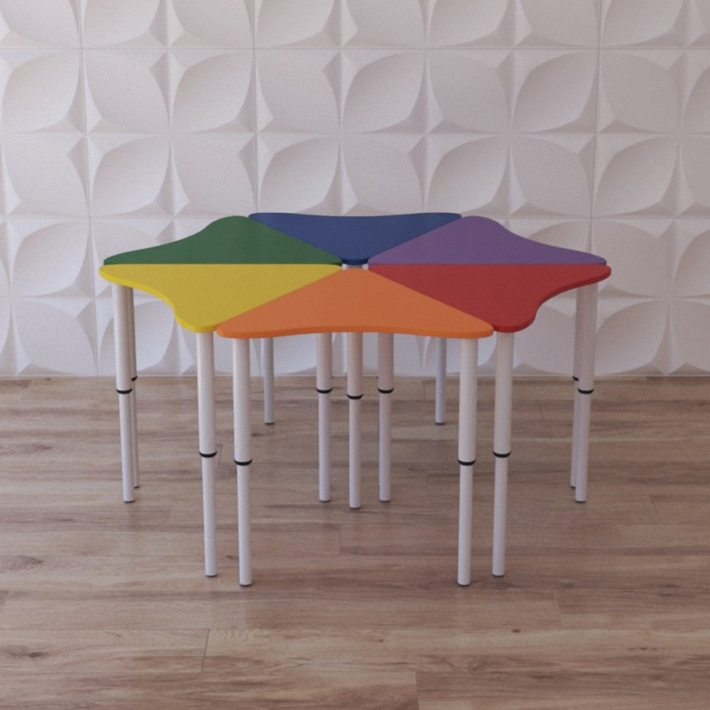 Шестиместный детский столик “Лети лепесток” – это ещё и комплект одноместных столов для оснащения учебными местами групп в ДОУ и яслях, коррекционных и развивающих центрах. Каждый из столиков состоит из столешницы и трёх телескопических ножек – благодаря им его можно отрегулировать на нужную высоту. Стол “Лети лепесток” станет незаменимым предметом мебели для детей; за ним могут с комфортом разместиться до 6 детей.