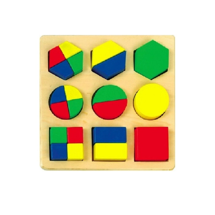 На деревянной доске нужно сложить геометрические фигуры из разноцветных частей, подсчитать количество частей в каждой фигуре. Игрушка дает начальные понятия о дробях, частях целого. Способствует формированию понятий формы, размера, развивает логическое мышление и моторику руки.