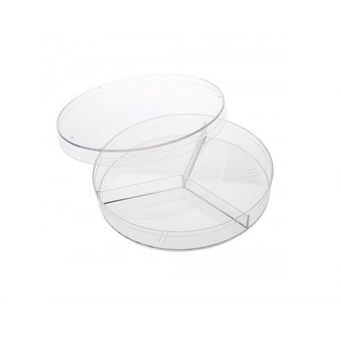 Трехсекционная чашка с крышкой диаметром 9 см. Чашка Петри предназначена для использования в микробиологии, фармацевтике, медицине, разделенного на три секции, и крышки, которая свободно накрывает основание.