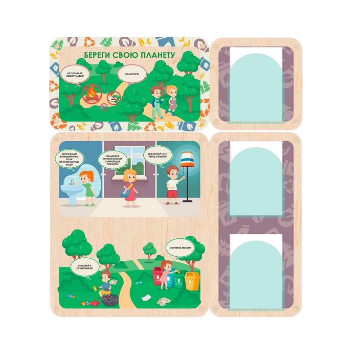 Информационный стенд для оформления стен в детских садах, начальной школе и организациях дополнительного образования. Красочные наглядные иллюстрации с простыми подписями помогут дошколятам понять правила экологичного поведения, даже если они ещё не умеют читать. Важная информация для родителей может размещаться в акриловых карманах около каждого стенда.