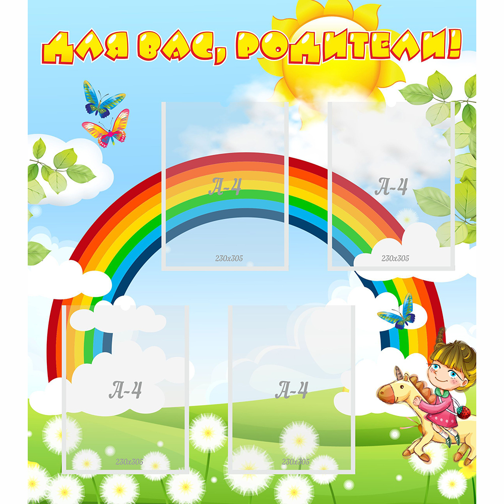 Родители должны принимать активное участие в жизни детского сада, и добиться этого можно, если вовремя до них доносить какие-то объявления, нововведения, в общем, нужную информацию. И сделать это можно легко и просто, с помощью замечательного информационного стенда, представленного на этой странице. Красочный и интересный, он будет украшать помещение, и привлекать внимание родителей. Любая представленная информация дойдет до своего адреса, потому что внушительный размер стенды и его дизайнерское решение помогут в этом.