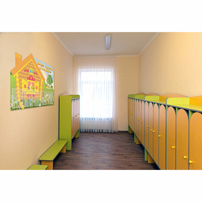 Дизайн стенда напоминает о летнем отдыхе в деревне. Тут и раскрашенный в яркие тёплые цвета деревянный домик, и порхающие над полевыми цветами бабочки и далёкая радуга. В шести специальных карманах можно размещать объявления, распорядок дня, меню в столовой, списки детей и многое другое.