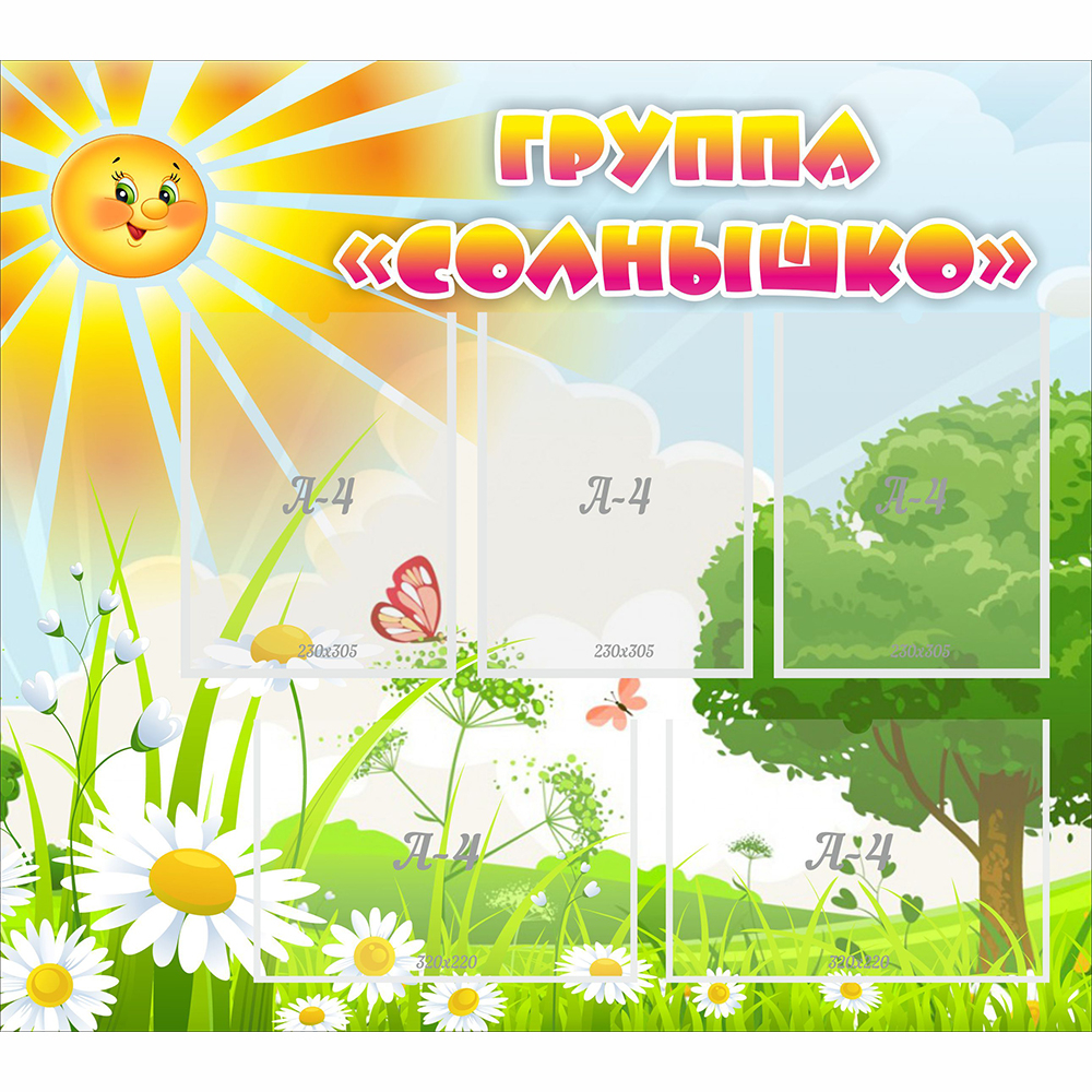 Каждая группа в детском саду должна иметь свой уголок, в котором будет размещена вся важная и полезная информация для родителей, воспитателей и маленьких детей. Веселым и жизнерадостным воспитанникам дошкольного учреждения непременно понравится оригинальный стенд «Группа Солнышко». Он яркий и привлекающий внимание, выполнен в приятных цветах, а также украшен улыбчивым лучистым солнцем и видами летней лесной опушки. Стенд оснащен 5 карманами для размещения информационных материалов формата A4.