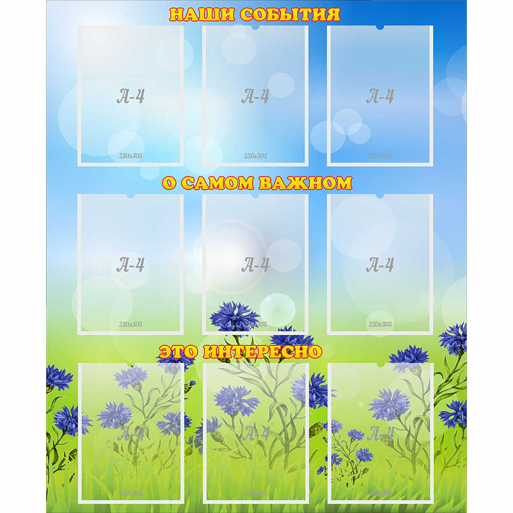 В специальных карманах формата А4 можно разместить важные объявления, плакаты, фотографии и различные информационные листы. Стенд поделен на три раздела: «Наши события», «О самом важном» и «Это интересно».