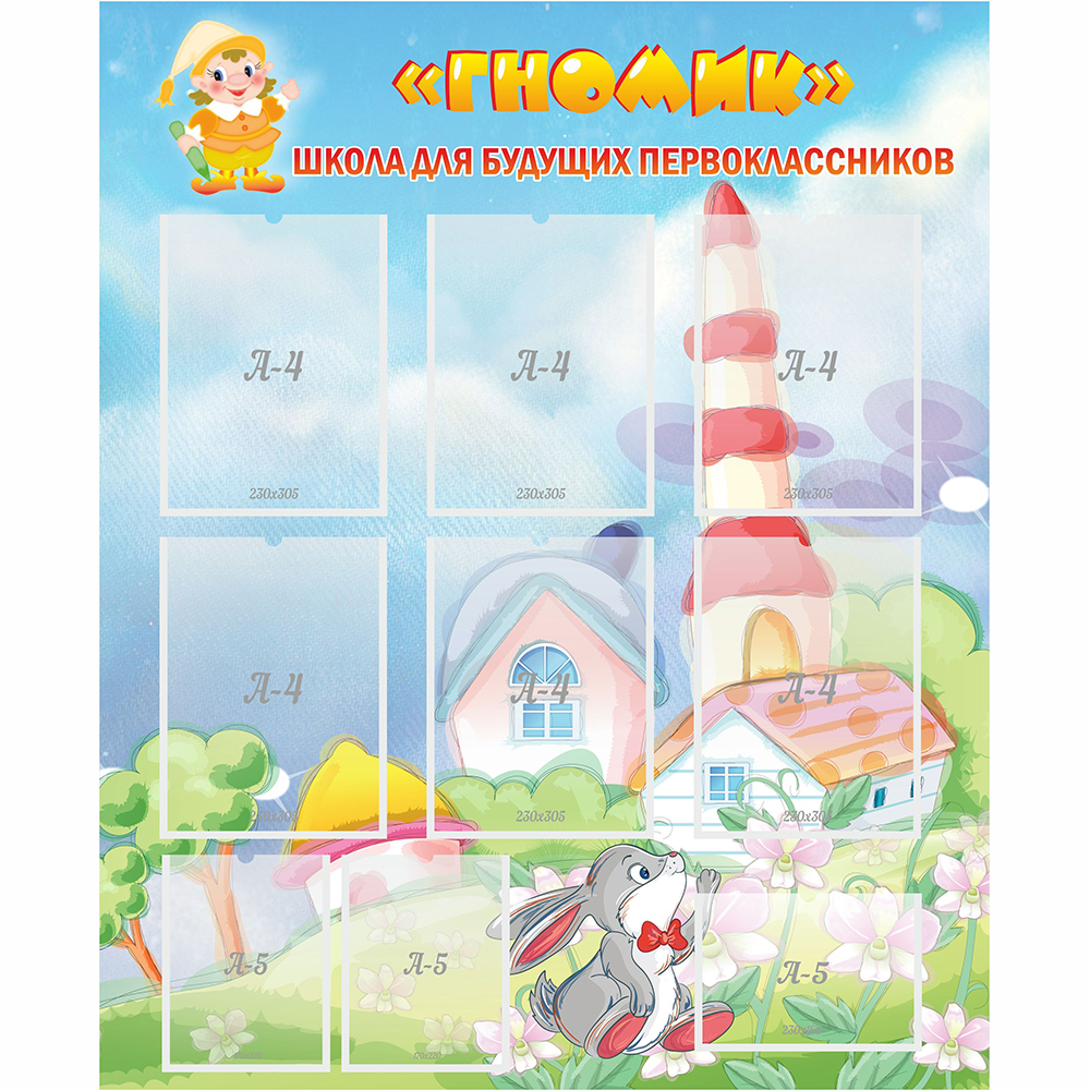 На общем неярком оформлении стенда, призванном акцентировать внимание на размещаемой информации, выделяется его название и фигурка Гномика с карандашом. Большое количество карманов позволит представить всем заинтересованным полноценную информацию о работе, ведущейся в детском саду по подготовке старших дошкольников к поступлению в школу. Это могут быть объявления об экскурсиях в школу, критерии оценки готовности детей к школьному обучению, советы родителям, разного рода анкеты и многое другое.