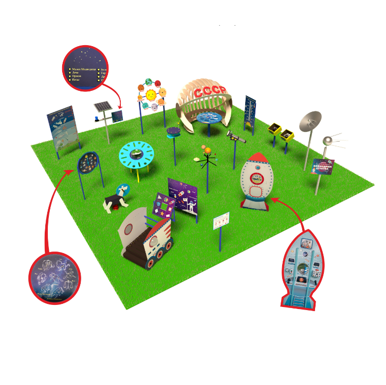«Детская космическая станция» - это уличный комплекс, в состав которого входят красочные интерактивные стенды и макеты. С их помощью дети осваивают первые азы астрономии.