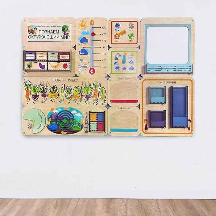 • Прочно закрепляются на стенах и не свалятся на детей, даже если они будут тянуть. Все материалы панелей безопасны для детей и сертифицированы. Малыши могут трогать, облизывать и грызть деревянные детали – их здоровью ничего не угрожает.