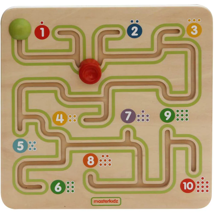 Панель предназначена для обучения счету от 1 до 10, изучения цвета и развития координации и двигательных навыков. Лабиринт с цифрами и соответствующим количеством точек.