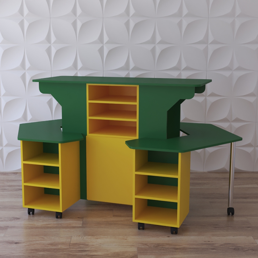 Модульный стеллаж «Весёлые занятия» станет отличным решением для небольшого помещения и групповых занятий с дошколятами. Небольшая площадь, однако, позволяет разместить за учебной поверхностью до 6 учеников. Конструкция позволяет хранить большое количество учебного и игрового материала.