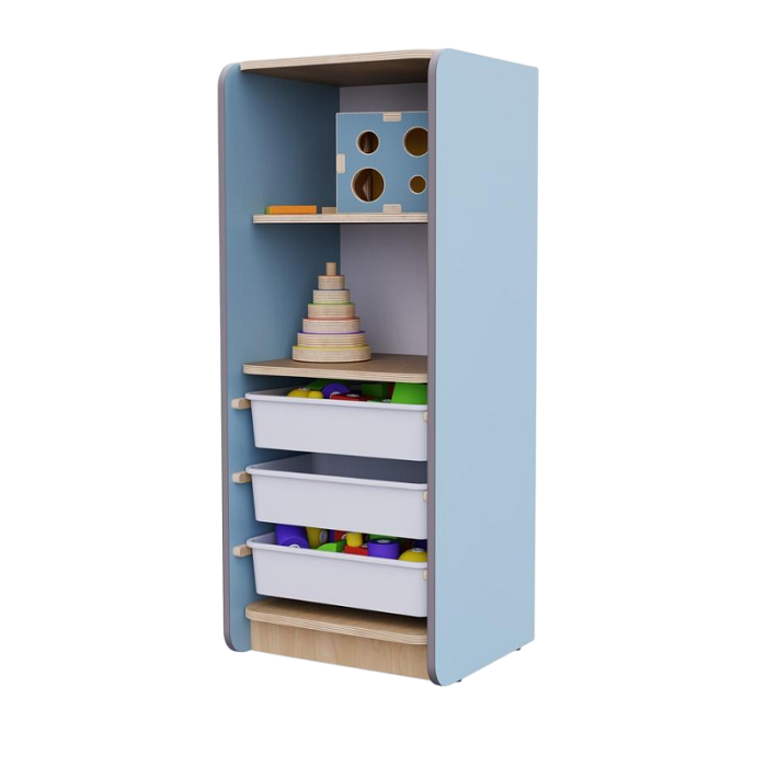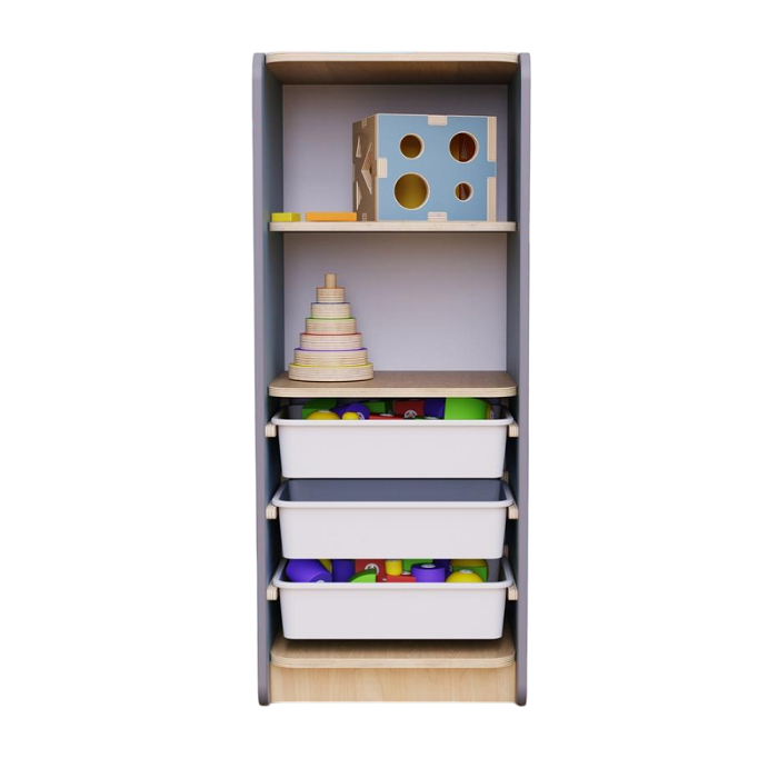 Открытый шкаф с двумя полками и тремя пластиковыми ящиками для оснащения игровых комнат в детских садах и организациях дополнительного образования. Этот открытый шкаф удобен и функционален, с ним легко создать систематизированное хранение и атмосферу порядка в ДОУ.