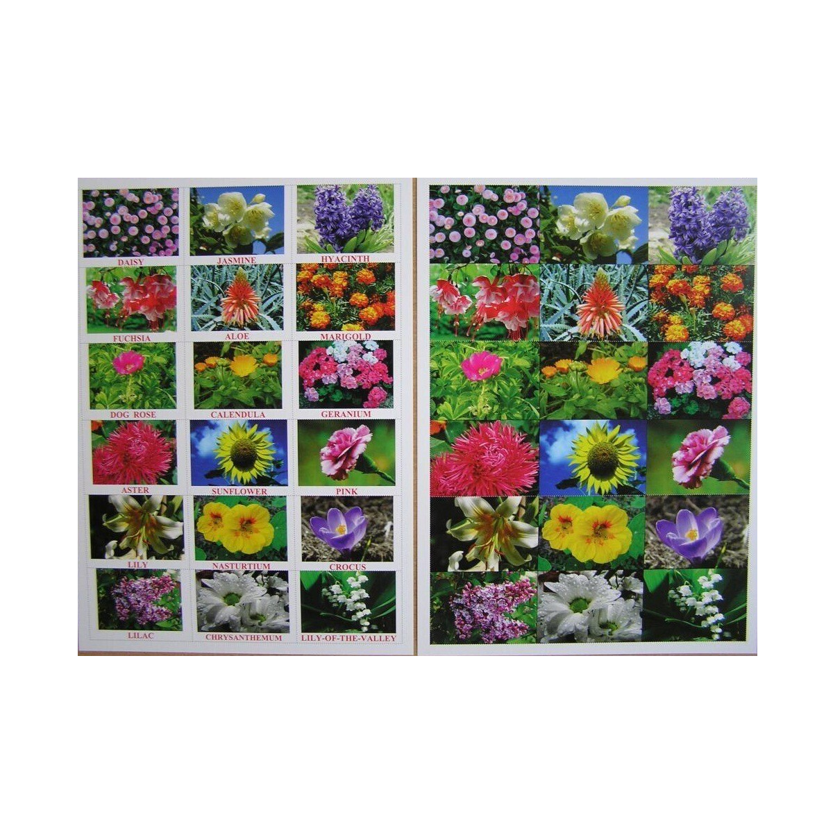Перевод (на карточках перевод не указывается): Роза, ирис, тюльпан, орхидея, георгин, гладиолус, кактус, нарцисс, анютины глазки, пион, фиалка, цикламен, петуния, гербера, мимоза, лотос, калла, гортензия, маргаритка, жасмин, гиацинт, фуксия, алоэ, бархатцы, шиповник, календула, герань, астра, подсолнух, гвоздика, лилия, настурция, крокус, сирень, хризантема, ландыш, ромашка, колокольчик, мак, одуванчик, василек, подснежник, вьюнок, клевер, мать-и-мачеха, камыш, пижма, крапива, лопух, незабудка, подорожник, лютик, папоротник, кувшинка.