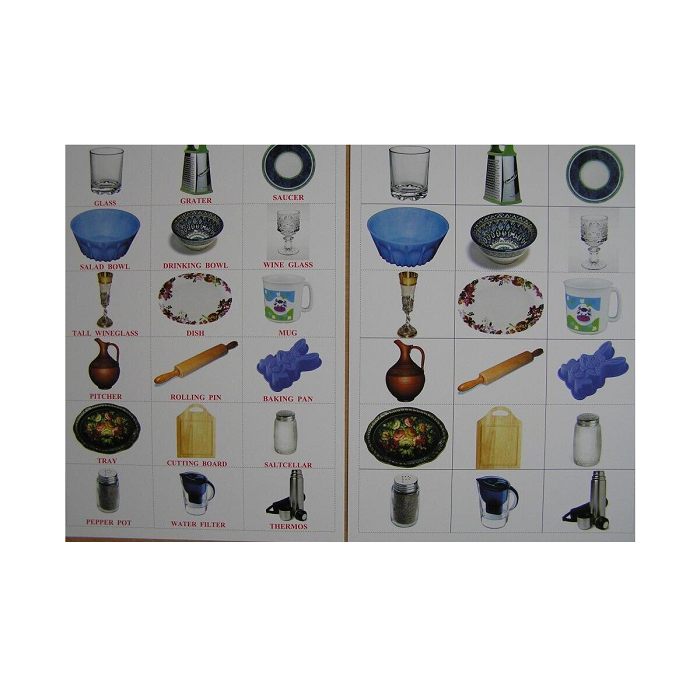 Перевод (на карточках перевод не указывается): Тарелка, ложка, вилка, нож, сковорода, кастрюля, миска, крышка, половник, шумовка, венчик, дуршлаг, самовар, противень, заварочный чайник, сахарница, салфетница, чашка, стакан, терка, блюдце, салатница, пиала, рюмка, фужер, блюдо, кружка, кувшин, скалка, форма для выпечки, поднос, разделочная доска, солонка, перечница, фильтр для воды, термос.