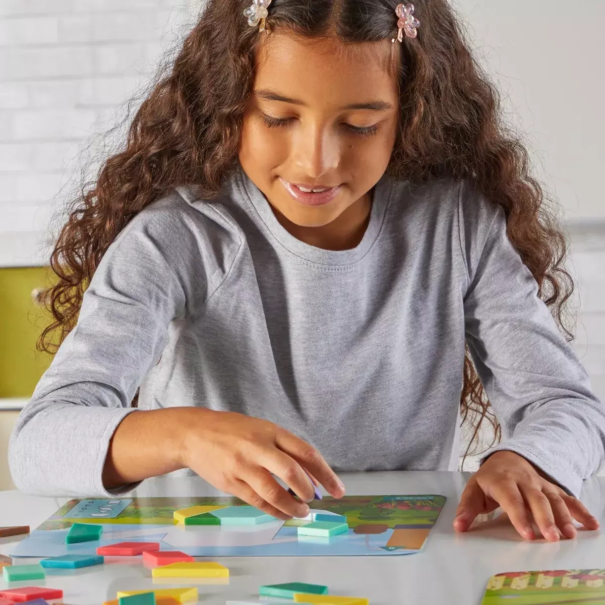 Задача – решить головоломки на 10 двусторонних карточках с помощью 100 разноцветных тактильных блоков. Ребёнок научится следовать шаблону, определять геометрические фигуры, отточит навыки сортировки и сравнения, а также узнает, как одеваться по погоде и что стоит успеть выполнить в определённое время года.