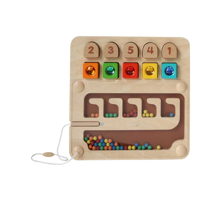 В верхней части панели расположены блоки с цифрами и цветными камешками, в нижней части лабиринт с разноцветными шариками и магнитной палочкой. Панель-лабиринт предназначена для обучения счету от 1 до 5, изучения цвета и развития координации и мелкой моторики.