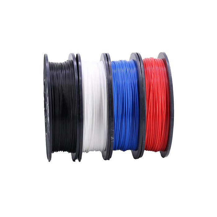Набор ABS пластика состоит из 4-х катушек, каждая весит по 500 гр.: синий, красный, белый, черный.