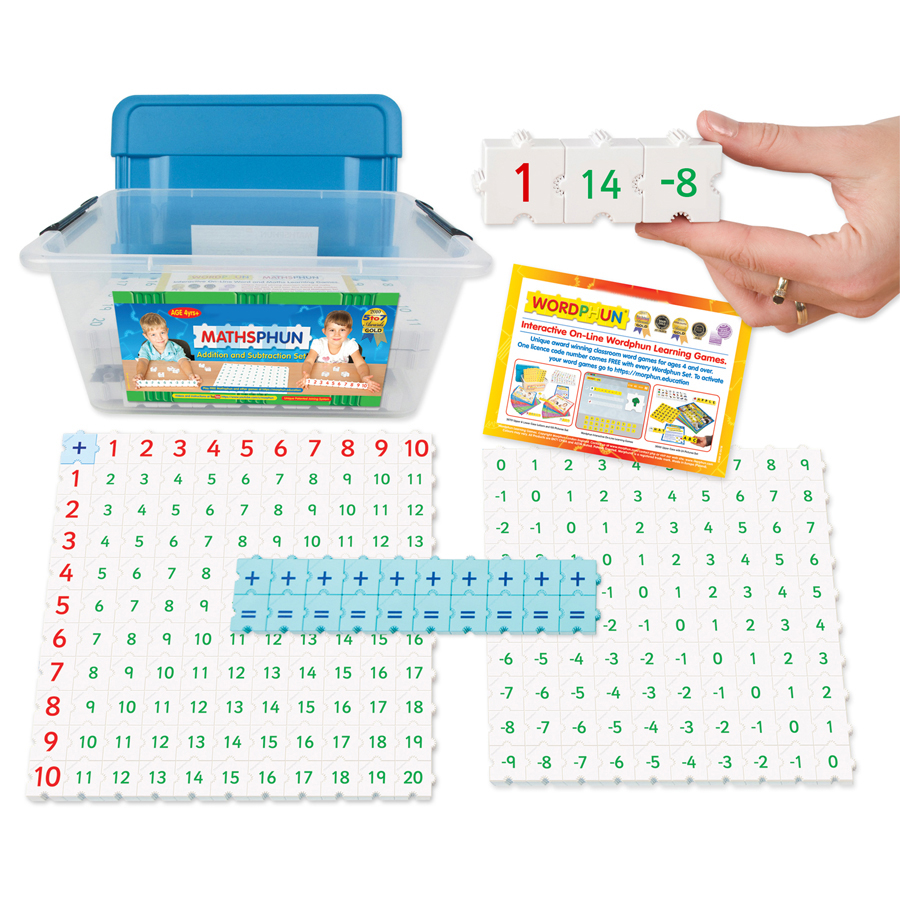 В состав набора включены более 220 белых деталей, включая детали с красными цифрами от 0 до 10 для формирования задания и детали с зелеными цифрами от 0 до 20 и от -1 до -9 для ответов на задания, а также голубые детали с математическими знаками «+», «–» и «=».