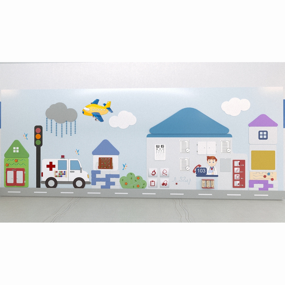 Настенная панель «Медицина» не нуждается в дополнениях и может выступать как самостоятельное оснащение игровой зоны в общественном учреждении (медицинской клинике, банке, кафе, частной компании) благодаря размерам и обилию разнообразных функций.